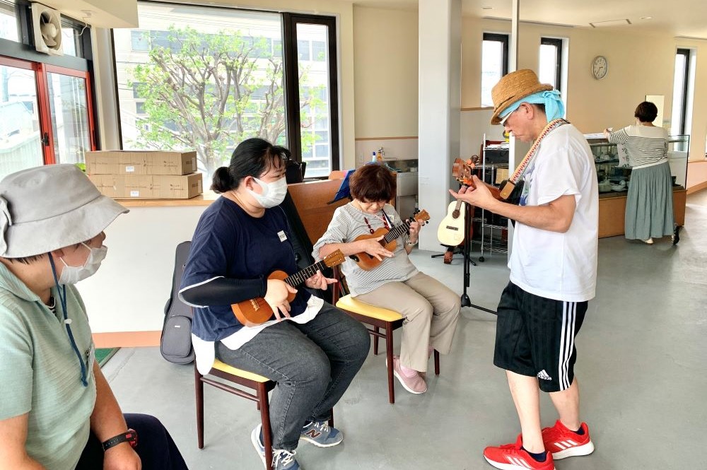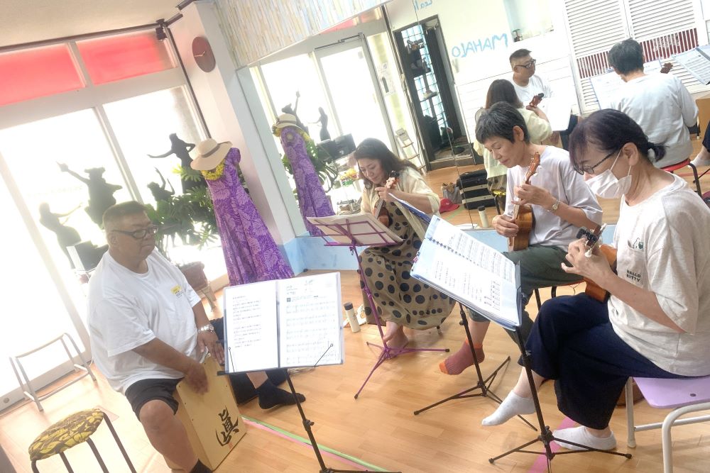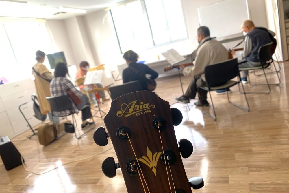 こちらの教室では自分のペースで、さまざまな楽器の仲間と一緒にワイワイ言いながら練習が出来ます。周りの人たちがみんな初心者なので気持ちが分かり合えるので楽しいですよ。