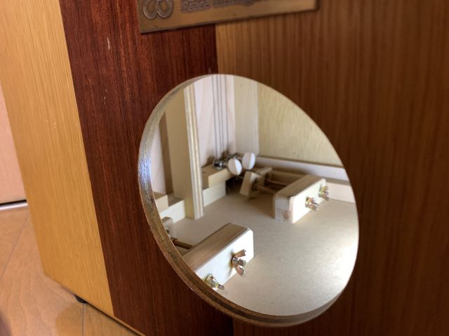 中はこんな感じになっていて、左右4本ずつ、計8本の響き線が打面裏に貼ってあります。これによってドンシャリのシャリがかなり効果的に鳴ってくれます。ただ、このタイプは設定が難しい😥もう一つ後のシリーズは全部ペグで調整出来るのでラクチンです。