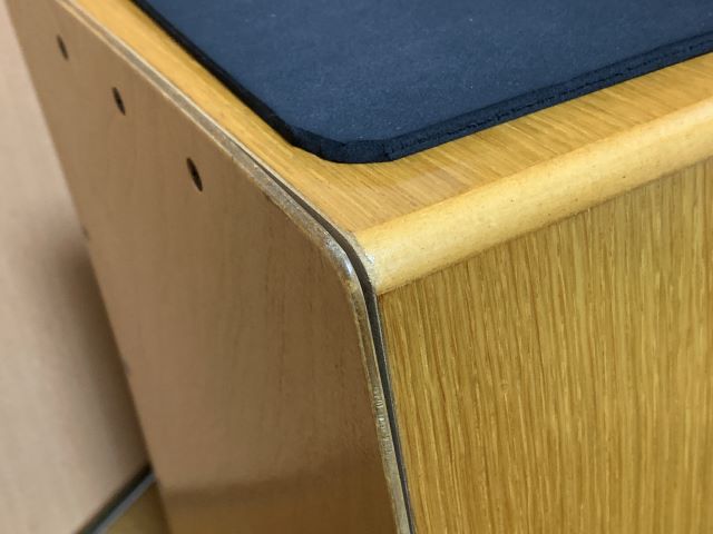 あと、よーく打面を見て頂きますとが少し湾曲している事も特筆すべき特徴です。僕が勝手に思っているのですが、これによって音が内部で反射しにくく、ボーンボーンと鳴らずにドッ!ドッ!とタイトで締まった音になっていると思われます。明らかに他のカホンと違い、音が超タイトです。