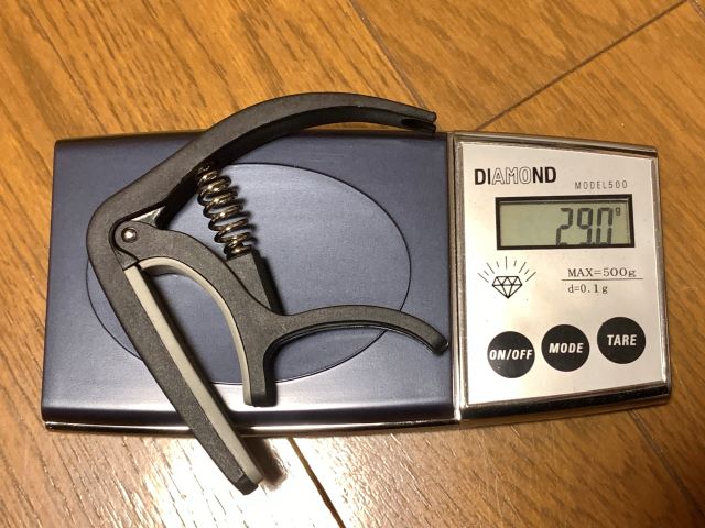 29.0gでした。このカポでもギター用としては結構軽い方の部類のものですが、それでも29.0gです。もうさすがにウクレレに装着すると「いや無理」となるくらいの重さでしたね。