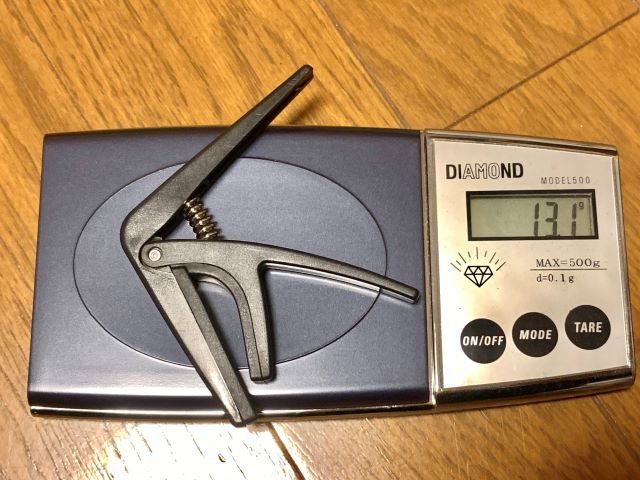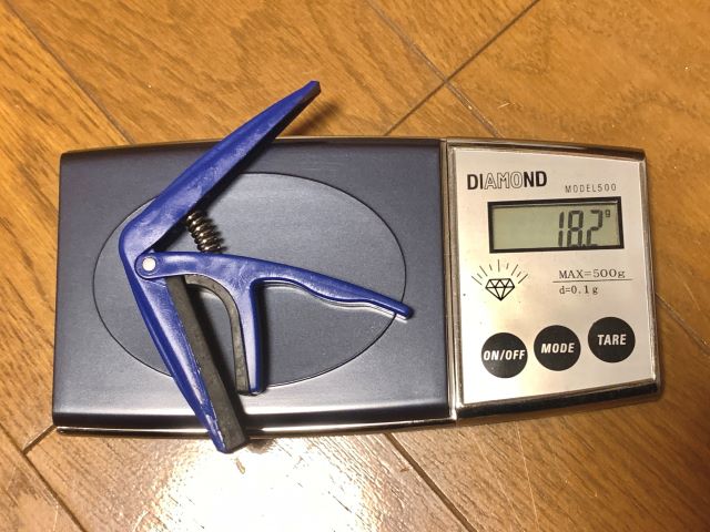 18.2gでした。約5g違いますね。これ、大したことないと思うでしょう?実際に持ってみると圧倒的な差が感じられます。ウクレレに装着するとその違いは歴然としていました。ちなみにギター用カポは