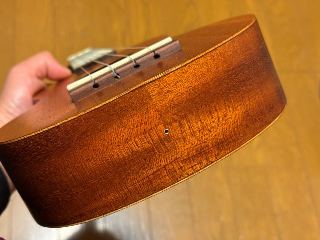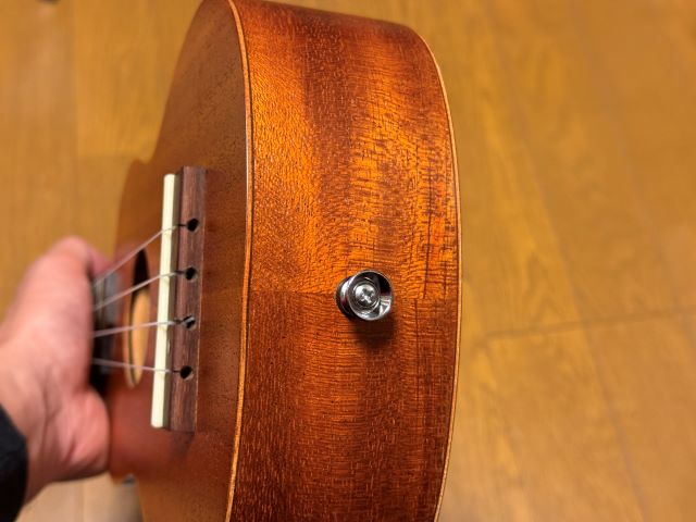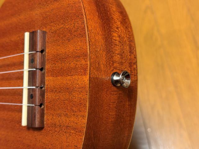 これで完成です。手順としては簡単なものですが、まっすぐにドリルを入れていく作業は結構緊張します。これが生徒さんのウン十万円のKAMAKAのウクレレとかだと手が震えます(ウソ)。